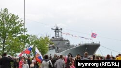 Для этого, специально из Новороссийска на керченский морвокзал 8 –го мая прибыл большой десантный корабль «Калининград». Несколькими залпами из корабля утром 9-го мая торжественно открыли Парад Победы. Не обошлось и без ритуального выноса государственного флага России и Знамени Победы.