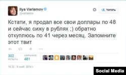 9 ноября известный в Украине и России блоггер и журналист Илья Варламов написал в своем твиттере, что продал доллары по 48 рублей и надеется через месяц откупить их обратно по 41 рублю за доллар. «Запомните этот твитт», – добавил он. И медиа-сообщество запомнило, а через месяц напомнило Варламову о его ошибке.