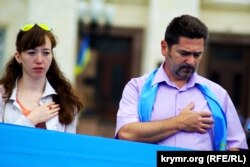 Участники прошедшего на площади Свободы митинга скандировали «Крым – это Украина!» на украинским и крымскотатарском языках, а также спели гимны Украины и крымскотатарского народа.
