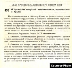 В Постановлении Президиума Верховного Совета №494, которое следовало непосредственно за Указом, – «О порядке применения статьи 2 Указа Президиума Верховного Совета СССР от 28 апреля 1956 года» – говорилось о том, что «... граждане татарской национальности... и члены их семей пользуются правом, как и все граждане СССР, проживать на всей территории в соответствии с действующим законодательством о трудоустройстве и паспортном режиме».
