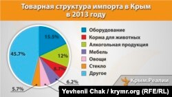 С приходом России доля импортируемого оборудования снизилась до 15,5%, хотя и остается лидером среди ввозимых товаров. Также Крым импортирует корма для животных (12% от общего объема), алкоголь (8,7%), мебель (6,2%), овощи (6,2%) и стекло (5,7%).