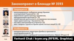 Так же, как и проект Сыроед-Чубарова, документ Парубия содержит норму о признании оккупированной неподконтрольной Украине части Донбасса. Еще одним сходством является то, что законопроект № 2004а запрещает провоз через административную границу с полуостровом грузов и товаров.