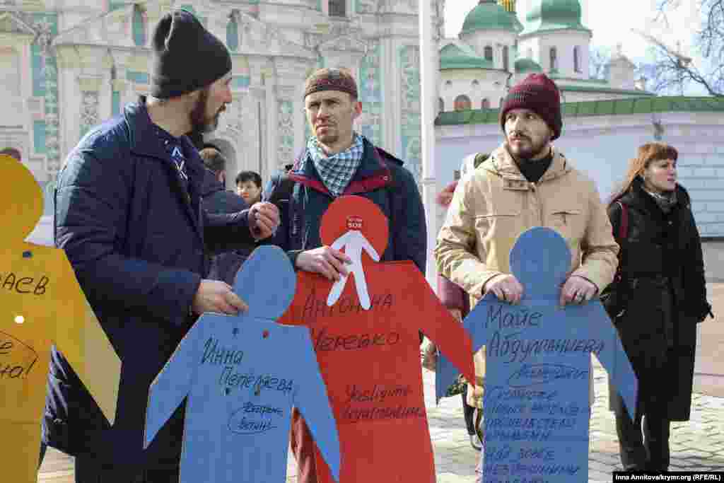 16 марта общественные деятели, крымчане, активисты, журналисты, правозащитники собрались на Софийской площади Киева, чтобы почтить память Решата Аметова, который стал первой жертвой российской аннексии Крыма. Участники акции держали в руках разноцветных картонных человечков, на которых были написаны имена всех тех, кто не смог присоединиться к ним сегодня, но поддержал акцию и почтил память крымскотатарского активиста. Два года назад Решат Аметов вышел в центр Симферополя с одиночным пикетом и выступил против действий российской власти в Крыму. Его похитили 3 марта 2014 года. 15 марта тело Аметова со следами пыток было найдено в лесу Белогорского района Крыма.