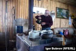Акчай заходит в третью одноэтажную постройку – штаб. Всюду на полу детали оборудования, канистры, приборы, инструменты. Слева от входа – огромная печь. "Ничего здесь этого не было. Печь я поставил. А потом потихоньку-потихоньку все оборудовал", – он ставит чайник на кирпичи, а сам садиться на большой диван рядом со столом и предлагает чай-кофе.