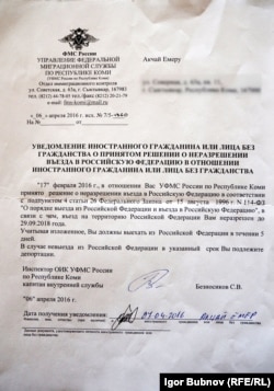 Именно поэтому в управлении миграционной службы 8 декабря 2015 года аннулировали вид на жительство Акчая Емера. Ему направили письмо с предложением прийти в ФМС 29 декабря, где и сообщили о том, что у него больше нет законных оснований находиться в России.