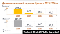 Наиболее масштабный уровень падения зафиксирован во внешней торговле полуострова. Так, по итогам января-ноября 2016 года внешнеторговый оборот Крыма составил всего 65,8 млн долл США – в 3 с лишним раза меньше уровня 2015 года (216,7 млн долл). Если сравнивать с временами до российской аннексии полуострова, крымский экспорт сократился примерно в 28 раз, а импорт – в 35 раз.