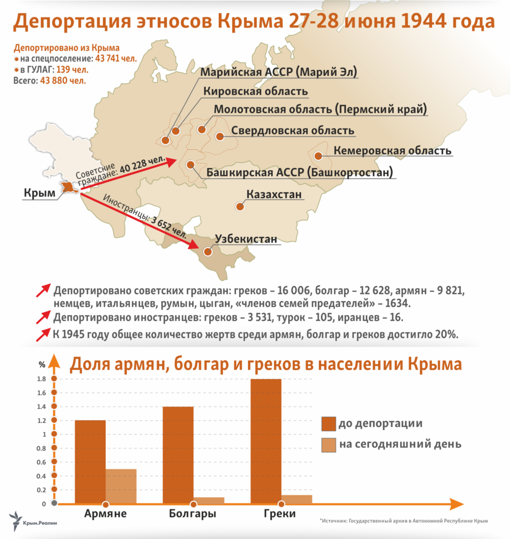 Депортация крымскотатарского народа в 1944 г. стала наиболее масштабным, но не единственным преступлением советского режима. Кроме них, насильственному изгнанию с полуострова в 1941-1944 гг. подверглись и другие этносы Крыма