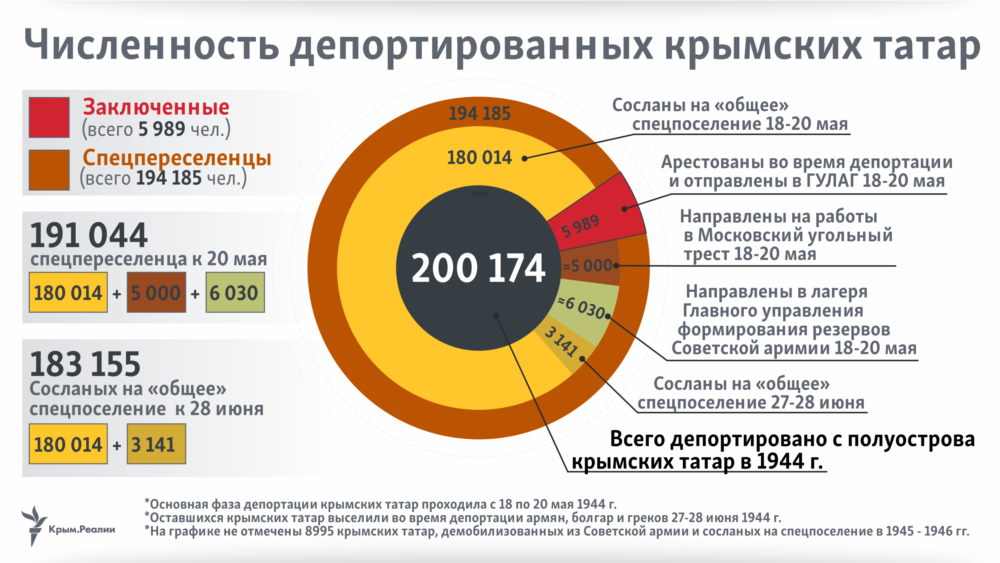 11 мая 1944 г. Сталин подписал постановление Государственного Комитета Обороны № 5859сс об организации депортации крымских татар. Основная фаза спецоперации началась еще до рассвета 18 мая и завершилась к вечеру 20 мая. Оставшихся крымских татар выселили во время последующей депортации армян, болгар и греков 27-28 июня 1944 г. Немногочисленных вернувшихся из мест спецпоселений повторно изгоняли за пределы полуострова до конца 60-х гг.
