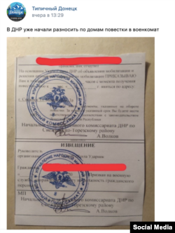 –​ По квартирам местным жителям разносят повестки о «всеобщей мобилизации». Уже все в ОРДЛО знают, что с неподконтрольной территории запрещен выезд мужчинам от 18-ти до 55-ти лет, в местных пабликах от этого волна возмущения. В последние годы «ДНР» и «ЛНР» всеми путями пытались заманить местных мужчин на «службу» в «армейские корпуса», обещая высокое по местным меркам довольствие. Но желающих было немного: почти в каждом подъезде есть истории о том, как мужчины на «службе» у «ДНР» гибли в первые дни из-за халатного отношения к ним российских командиров, которые де-факто командуют «армейскими корпусами». Сейчас люди в открытую говорят о том, что под шумок Россия пытается любыми путями «залатать дыры» в «армейских корпусах», в подразделениях которых хронический некомплект. Также людей стали бомбардировать смс-сообщениями с призывами «стать на защиту своего дома и отечества».