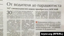 «Крымская газета» в главном материале номера рассказывает о деятельности российского Добровольного общества содействия армии, авиации и флоту (ДОСААФ). В его региональных отделениях и в образовательных центрах готовят специалистов по 147 «массовым техническим специальностям» – от водителя категории «А» до парашютиста. – «Молодежь всегда интересуется мероприятиями, где есть Герои России и Советского Союза. Такой формат мероприятий надо продолжать, – цитирует издание подконтрольного Москве главу Крыма Сергея Аксенова. – Обсудили рабочие вопросы, которые касались непосредственно развития и функционирования ДОСААФ на территории республики Крым. В рамках поддержки ДОСААФ и реализации программы будет выделяться из республиканского бюджета 30 млн рублей». Глава Крыма отметил, что окончательно региональная программа развития отделения ДОССАФ в Крыму будет сформирована до 1 июля.