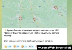 Крымские паблики с пятницы публикуют информацию о продвижении колонн ЧВК «Вагнер» по территории России и боестолкновениях между наемниками и регулярными частями российской армии.
