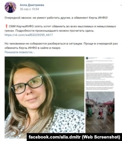 Алла Дмитриева заявляет, что в середине августа ей поступил звонок с требованием снять с сайта публикацию последствиях потопа в городе «Потоп в Керчи: власти все знали, но ничего не сделали». Имени звонившего она не называет, хотя и говорит, что голос был знакомым.