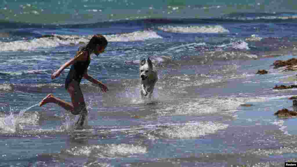 Девочка бегает со своей собакой вдоль линии пляжа в Евпатории.