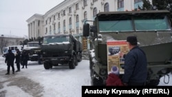 В центре Симферополя на площади Ленина власти Крыма выставили российскую военную технику в «День защитника Отечества», который отмечают в соседней России 23 февраля.