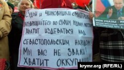 В руках митингующие держали плакаты с лозунгами «В Украине заработал! В России отжимают», «Судьи и чиновники с материка! Возвращайтесь по своим родным местам, хватит издеваться над севастопольским народом! Мы вас не звали! Хватит оккупации!».
