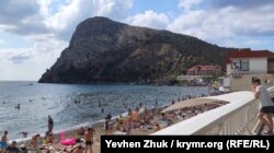 Вот и пляж. Отдыхающих довольно много как для начала осени. Сказываются температура воздуха 26-27 градусов и воды 20-21. В закрытом с трех сторон горами Новом Свете почти всегда на один-два градуса теплее, чем в Севастополе, с трех сторон опоясанном морем и продуваемом насквозь всеми ветрами.