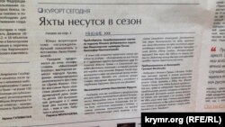 «Крымская газета» в статье «Яхты несутся в сезон» сообщает об открытии так называемого высокого курортного сезона на полуострове. В честь этого события в Геленджике стартовали парусные яхты двух классов, которые финишировали в Ялте. Регату «Золотое кольцо Боспорского царства» встречали местные жители и подконтрольные Москве власти. Российский министр курортов и туризма Крыма Вадим Волченко назвал регату «первым подобным проектом за всю современную историю России». «В будущем тот путь, который прошли спортсмены, станет новым туристическим маршрутом, что объединит весь юг России. Также благодаря проходу яхтенной регаты по черноморскому побережью мы можем выявить все необходимые технические моменты, чтобы в ближайшее время внести конкретные предложения в стратегию развития Крыма», – заявил Волченко.
