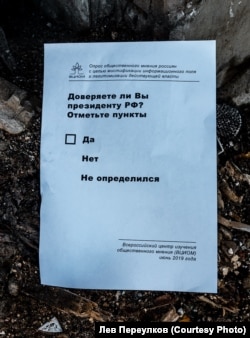 "Доверяете ли вы Путину?" – гласит вопрос на одном из них. Внизу – три варианта ответа, "да", "нет", "не определился", но квадратик для галочки напечатан только напротив первого. "Готовы ли вы выйти на протестную акцию в своем городе?" – гласит вопрос на другом листе. Варианты ответов такие: "Нет, не готов" и "Да, я поддерживаю идеи насилия и хочу дестабилизировать ситуацию в регионе через поддержку опасной оппозиции". Еще один опросный лист: "Есть ли у вас претензии к действующей власти? Опишите их ниже в специальном поле". Специальное поле, однако, оказывается полностью черным, написать на нем что-то попросту невозможно.