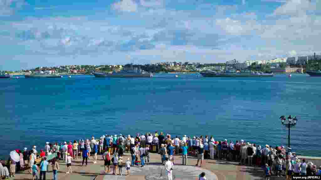 Для парада в двух линиях ошвартовали подводную лодку «Краснодар», ракетный крейсер «Москва», фрегат «Адмирал Григорович», сторожевой корабль «Пытливый», малый ракетный корабль «Мираж», новейший малый ракетный корабль «Вышний Волочек», большой десантный корабль «Новочеркасск» и сторожевой корабль Пограничной службы ФСБ России «Изумруд».