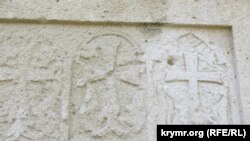 То, что это армянский храм, всегда легко определить по хачкарам. Это такие вставки в стене храма с изображением креста. Слово хачкар образовано из армянских корней «хач» – «крест» и «кар» – «камень». Вот эти хачкары на стене храма Иоанна Богослова.