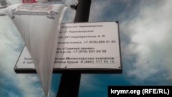 На информационном табло пляжа рядом с точкой продажи шаурмы значатся номера телефонов «экстренных служб» и «горячих линий» Минкурортов Крыма, а также властей района. Правда, размещены они на высоте не менее трех метров от земли и половину текста на них закрывают флажки с символикой города.