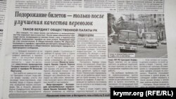 ​«Крымские известия» в публикации под заголовком «Подорожание билетов – только после улучшения качества перевозок» рассказывает о заседании подконтрольной России Общественной палаты Крыма, на котором рассматривался вопрос о подорожании билетов в общественном транспорте городского и пригородного сообщения. «Граждане жалуются на качество услуг, выпадение сел из графика движения, а перевозчики – на отсутствие возможностей его повысить, «сгустить» маршруты, – заявил зампредседателя российского Госкомитета по ценам и тарифам Крыма Вячеслав Мартынов. Чиновник считает: пора ввести новые тарифы, учесть все расходы транспортников, нормативы труда и отдыха водителей, оснащение машин тахографами. Так, в Алуште, Джанкое, Керчи, Симферополе, Феодосии, Ялте и Евпатории предлагается поднять тариф с 13 до 17 рублей. В Саках и Судаке – с 11 до 15, в Бахчисарае – с 12 до 15 рублей. «Разгорелись бурные споры между пассажирами, общественниками и перевозчиками. Первые сетовали на нарушение графика движения, грубость водителей. Перевозчики парировали, мол, из-за разбитых дорог выходит из строя техника, что и отражается на графике. А хамство – реакция на грубость льготников, они не ангелы и за словом в карман не лезут», – пишет газета. По итогам заседания принято следующее решение: «Совет Общественной палаты полагает возможным согласовать введение новых тарифов на пригородные перевозки и перевозку пассажиров в городском сообщении по муниципальным образованиям Крыма при соблюдении следующих условий: автобусы будут содержаться в чистоте, водители перестанут хамить пассажирам, курить, отказывать льготникам в проезде, осуществлять перевозку пассажиров в соответствии с утвержденным расписанием (уделив особое внимание перевозке в вечернее время), использовать имеющееся в автобусах оборудование (кондиционеры, печки, для комфорта пассажиров в автотранспорте будут установлены тахографы)».