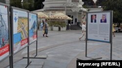 На постаментах, установленных на набережной города, около двух десятков фотографий о Москве и достижениях Крыма в российских реалиях.