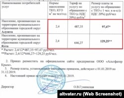 На следующий день после приезда Аксенова в Ялту директор «Альтфатер Крым» Ольга Гуминская подписала приказ о снижении тарифа на сбор и вывоз мусора до 129,2 руб. с человека в месяц в Ялте и 97,4 руб. с человека – в Алуште.
